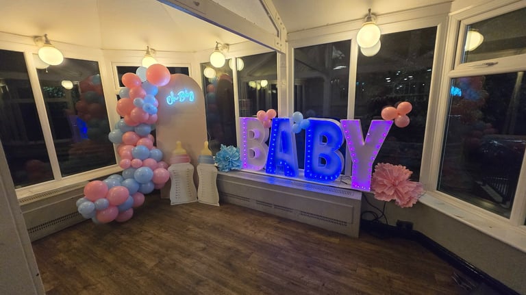 decorations - a great gender reveal set up that includes backdrop, neon light, balloons, cardboard cut outs of baby bottles, and the Letters BABY, projected count down and photos
